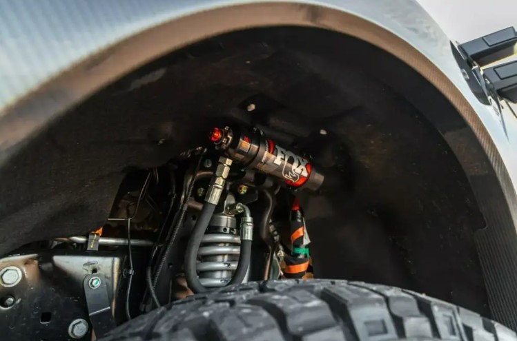 El trabajo más profundo aparece en el chasis. Hennessey equipa a la F-250 con una suspensión todoterreno BDS, que eleva la carrocería unas 5 pulgadas respecto al modelo estándar. El conjunto se complementa con amortiguadores FOX 2.5 con depósito remoto y regulación DSC, preparados para soportar exigencias extremas en uso off-road continuo.